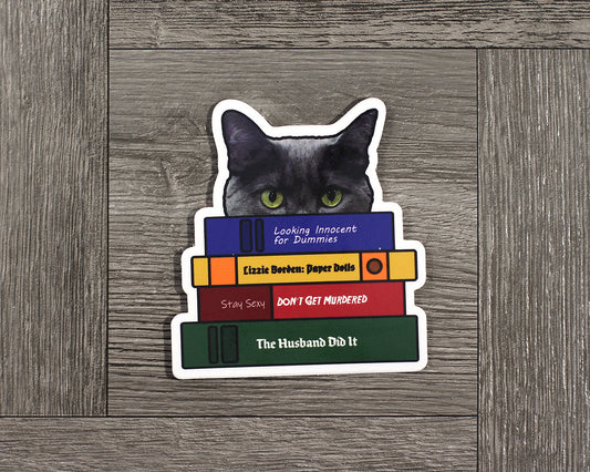 Sale price $4.00 USDThe sticker is a picture of Murder Cat with a stack of true crime books. Titles include: "Looking Innocent for Dummies," "Lizzie Borden Paper Dolls," "Stay Sexy Don't Get Murdered,"... -