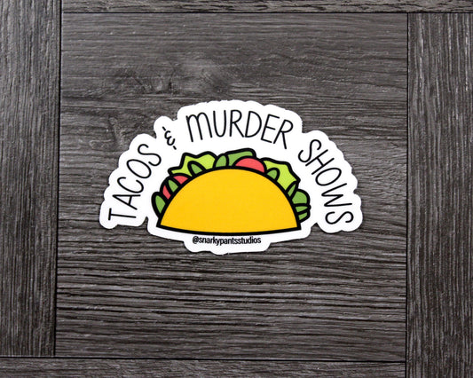 Sale price $4.00 USDThe sticker is a picture of a taco that says "Tacos & Murder Shows." It's made of weather resistant vinyl so it can be displayed indoors and outdoors or even... -