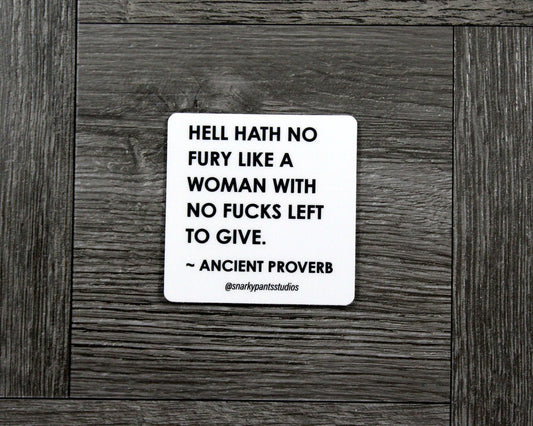 Sale price $4.00 USDThe sticker says "Hell Hath No Fury Like A Woman With No Fucks Left to Give - Ancient Proverb" It's made of weather resistant vinyl so it can be displayed... -