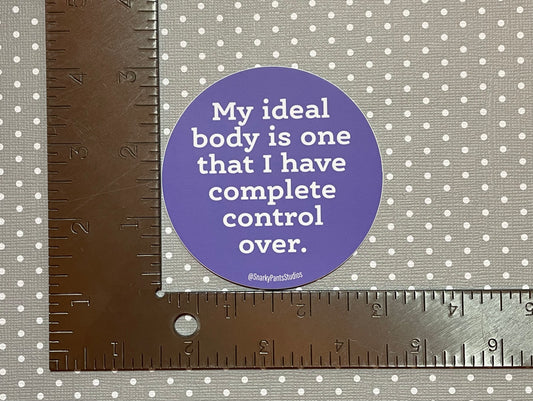 Sale price $4.00 USDThe sticker reads "My ideal body is one I have complete control over." Details:-Durable, weather resistant vinyl stickers.-This listing is for a sticker that is 3" x 3".-Ships within 1-3... -