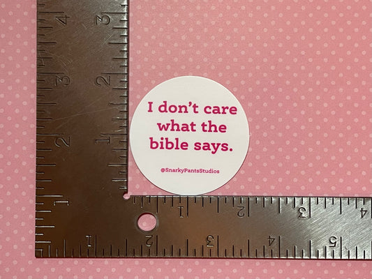 Sale price $4.00 USDThe sticker is a white circle that reads "I don’t care what the bible says." Details: Durable, weather resistant vinyl stickers. This listing is for a sticker that is 2"... -