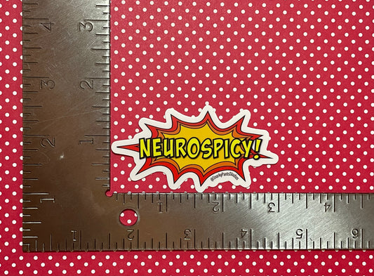 Sale price $4.00 USDThe sticker reads "Neurospicy."Details: Durable, weather resistant vinyl stickers. This listing is for a sticker that is 3" x 1.58". Ships within 1-3 business days of ordering via USPS First...