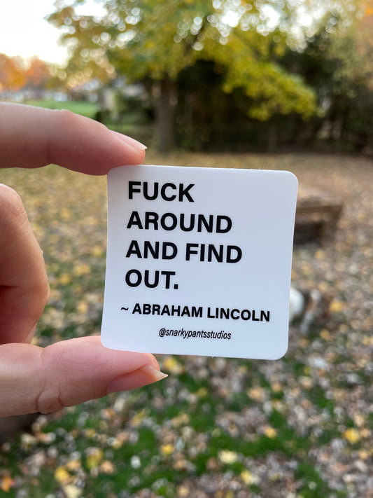 Sale price $4.00 USDThe sticker is a white, rounded square that reads "Fuck Around and Find Out. ~Abraham Lincoln" Details:-Durable, weather resistant vinyl stickers.-This listing is for a sticker that is 2” x... -