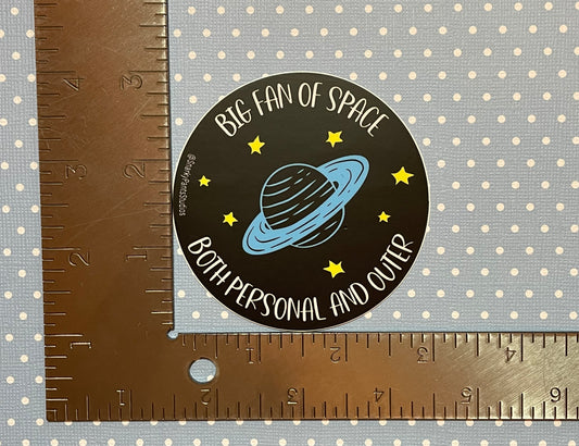 Sale price $4.00 USDThe sticker reads "Big Fan of Space Both Personal and Outer" Details:-Durable, weather resistant vinyl stickers.-This listing is for a sticker that is 3" x 3".-Ships within 1-3 business days... -