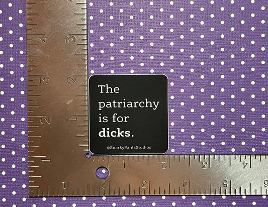 Sale price $4.00 USDThe sticker is a black rounded corner square that reads "The patriarchy is for dicks." Details:-Durable, weather resistant vinyl stickers.-This listing is for a sticker that is 2" x 2".-Ships... -
